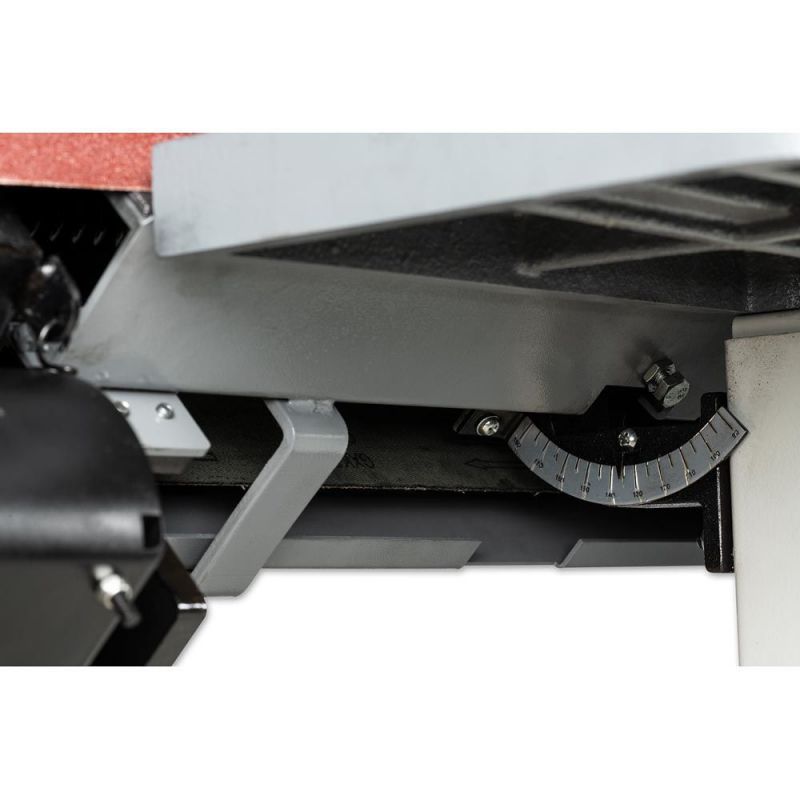 - The table has a standard 3/4" x 3/8" mitre slot to take a mitre fence. The dust hood can be rotated to clear the end of the belt for easy belt changing, and also to allow a small table to be mounted for sanding curved work. The stand is made from thick gauge welded steel and had a very useful belt storage cupboard. Smooth running, quiet in use, a very useful finishing machine.