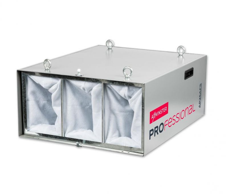 - With a powerful 150W motor, the AP25AFS Air Filter is intended for workshops of 300m³ or less. The air passes through the electrostatic pre-filter into the main pleated filter, filtering 98% of all particles 5 microns in size and 86% of all particles 1 micron in size. It comes with a remote control unit offering three settings for the motor speed and three different time settings of 1, 2 or 4 hours. This allows the unit to run after work has finished to clear the air ready for the next day. The machine runs reasonably quietly with noise levels of speed 1: 62 dB. speed 2: 66 dB. and speed 3: 68 dB.