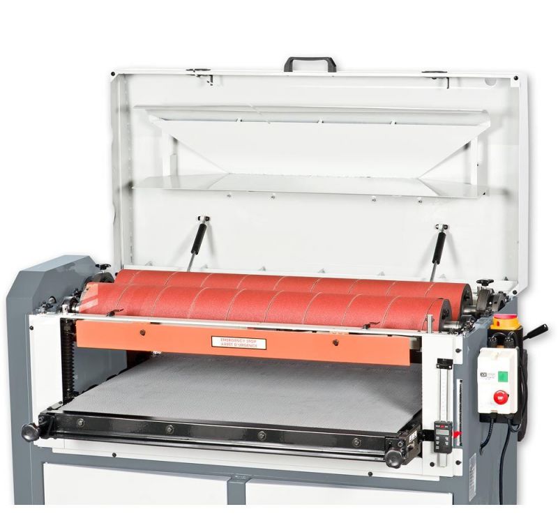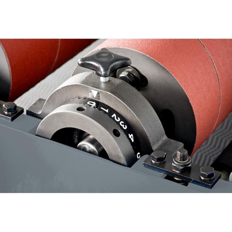 - The 150mm diameter drums are precision machined from aluminium castings. The abrasive is wound spirally around the drums and securely held by wedge clamps. Coarser abrasive on the front and finer on the rear. There is a very accurate setting system for the rear roller, allowing easy adjustment to accommodate the different grades of abrasive. Three pressure rollers maintain contact between the work and the conveyor belt. This ensures that the work is held in close contact with the belt, giving safe operation and a uniform thickness to the finished work.