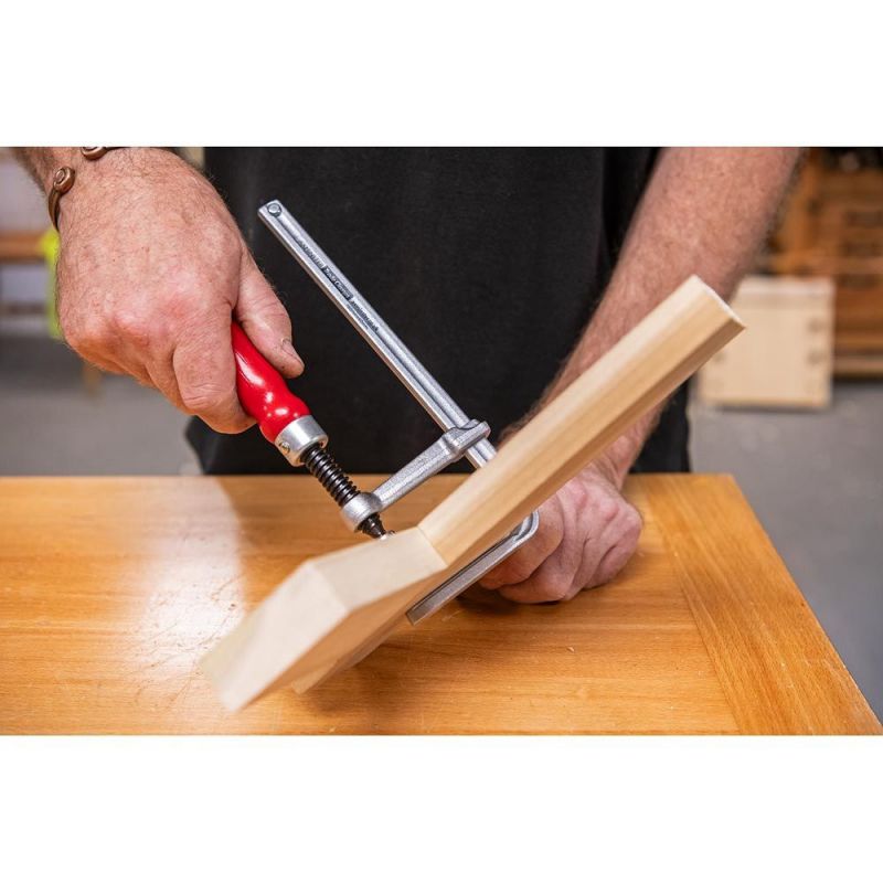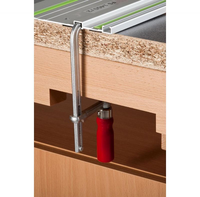 - An F-clamp with a specially designed head that fits into the slot of power tool guide rails. It is compatible with the following guide rails, amongst others: Festool FS, Makita, Milwaukee, DeWalt, Kreg, Rigid, Lidl Parkside and Aldi Workzone (unfortunately not Bosch). The clamp has a plastic pad on the swivel shoe to protect the work surface.