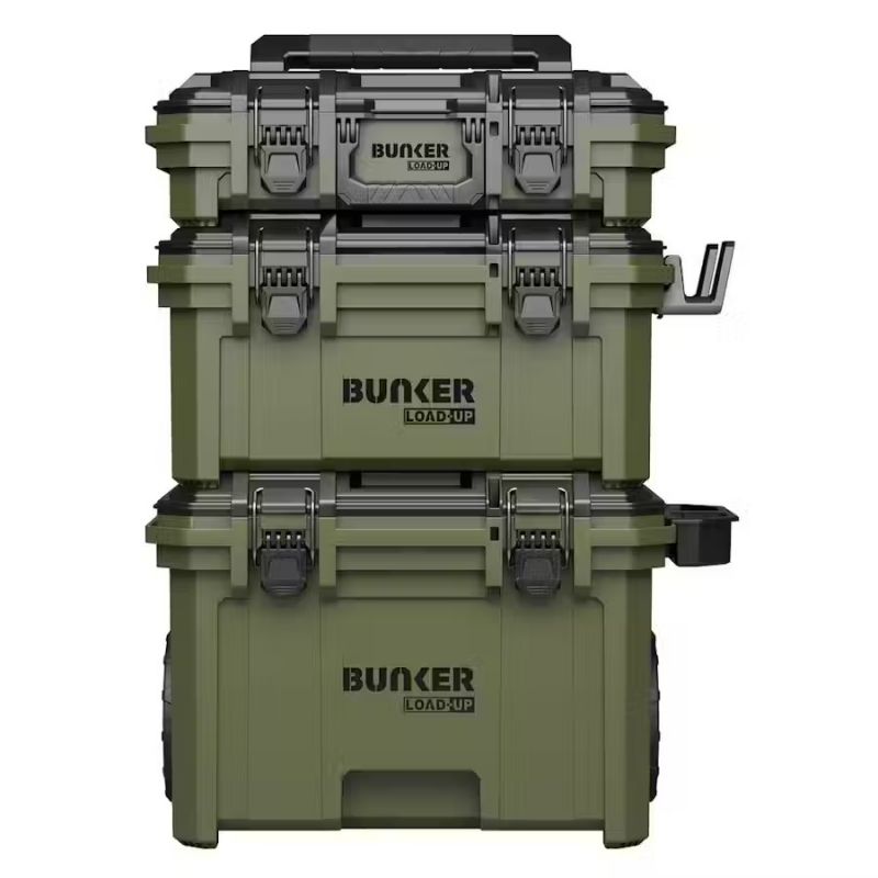 - This ready-made BUNKER Load-Up combination includes a 340mm rolling tool box, plus a 230mm and 100mm stacking toolbox. Plus accessories including two side rail hooks, nest bin, waterproof organiser and two transparent organisers.