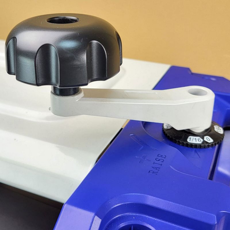 - The thicknessing height is quickly set using a large adjusting handle and reading from a scale, marked in both metric and imperial measurements. This setting can be physically secured using the cutting depth locking handle to ensure repeatability of the cutting depth. The timber is fed through the cutters by two rubber coated drive rollers. The cutter block rotates at 9000rpm leaving a smooth unmarked finish. A cut of up to 3mm deep can be made, when more than 3mm needs to be removed, simply use the quick action depth stop to ensure final dimension is not exceeded. Then make multiple passes to obtain the desired depth.