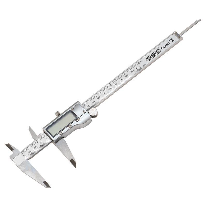 - These digital calipers have an extra-large LCD screen for easy readability of measurements. Readings can be displayed in either inches or mm, and the zero button can be used at any time to allow for differences in measurements. The thumb roller and locking screw enable smooth sliding, accurate positioning and fine adjustment. Made from hardened stainless steel, these calipers are built to last. They operate with an included LR44 alkaline button cell battery and feature an auto power-off mechanism that activates after five minutes to help conserve battery life. Supplied in a protective plastic storage case.
