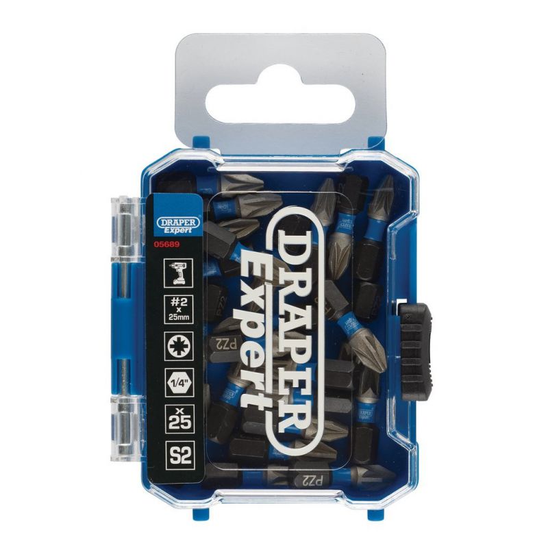 Draper Expert PZ-Type Impact Screwdriver Bits, No.2 x 25mm, 1/4" Hex (Pack of 25) - 05689