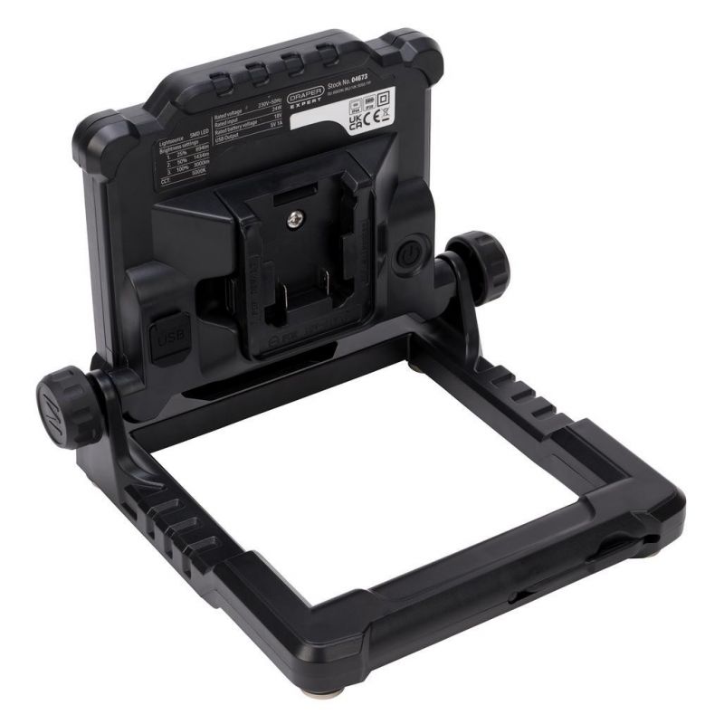 This super bright AC/DC hybrid work light can be powered using the included 100-240V AC mains adaptor or a DC 18V rechargeable battery (sold separately). The adjustable stand allows the beam to be directed, and it easily folds for convenient storage. There are three brightness settings, ranging from 694-3,000 Lumens. The magnetic base and hanging hook provide additional options for versatile use. The work light incorporates a USB 5V/1A output for charging mobile devices. It comes with a power tool battery adaptor that is compatible with DeWalt® and Milwaukee®.