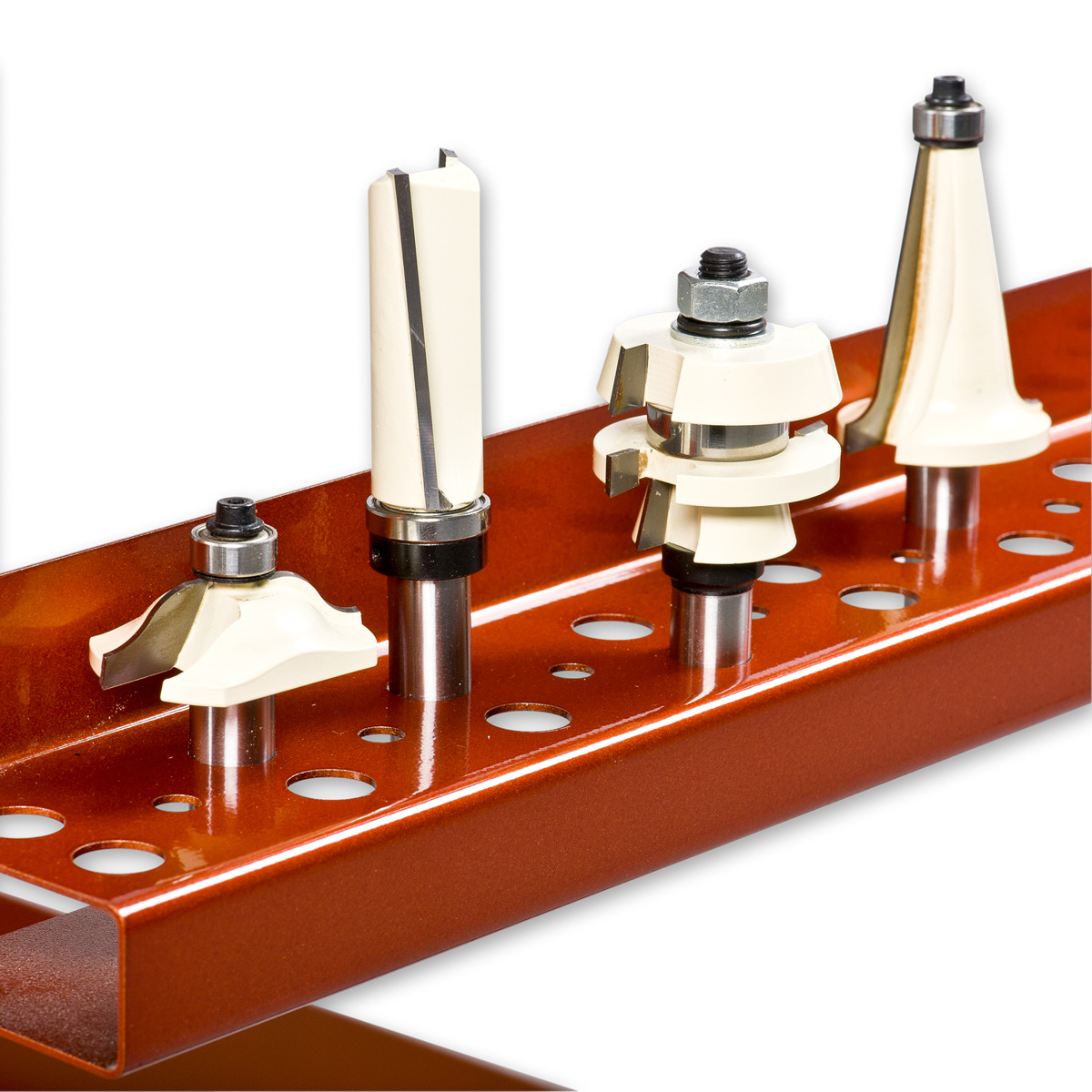 The UJK Professional Leg Stand is of sturdy construction with a foot operated retractable castor for excellent mobility around the workshop. A neat rack is provided for keeping your most popular router cutters to hand and provision is made for storage of the supplied mitre fence assembly. Stand height approximately 890mm.