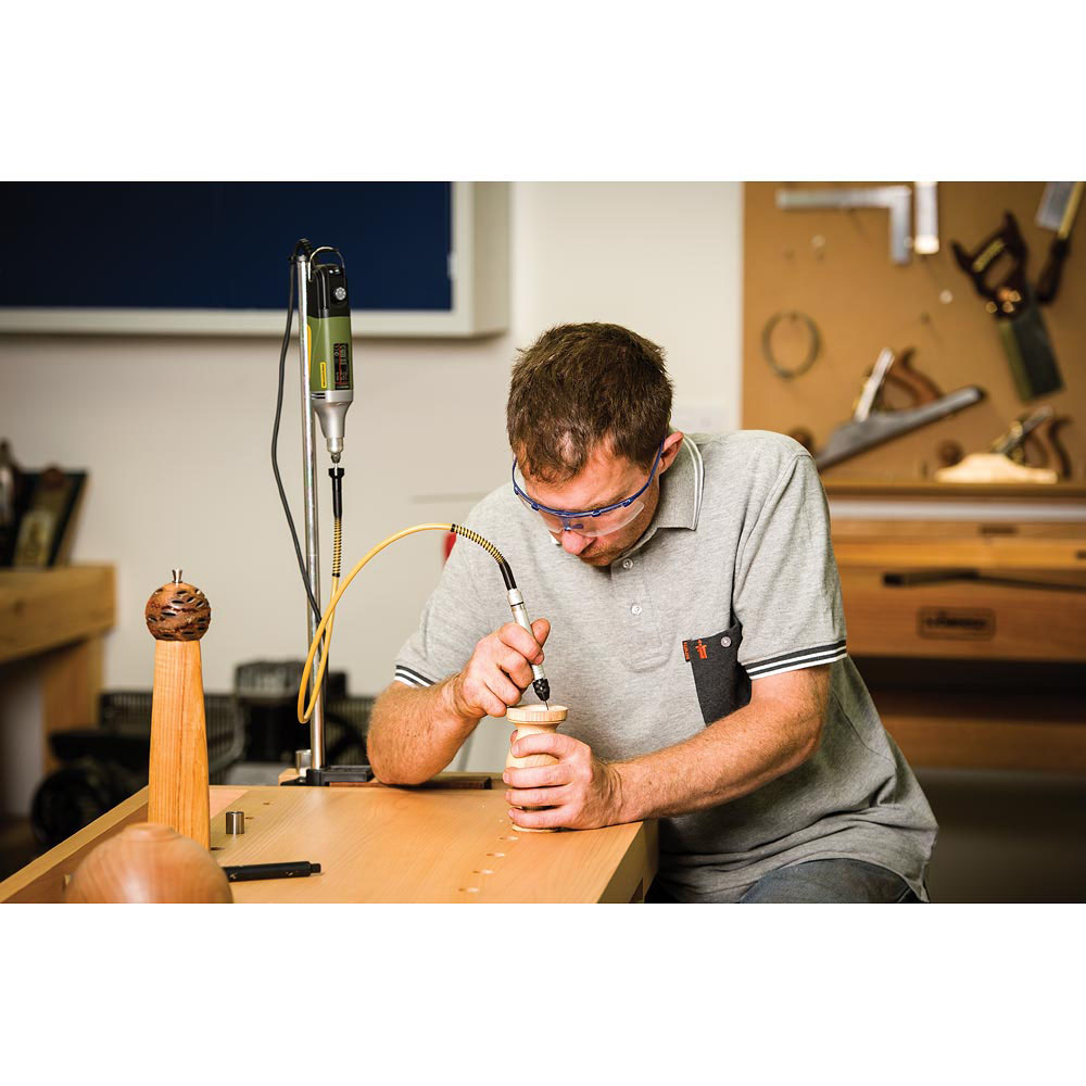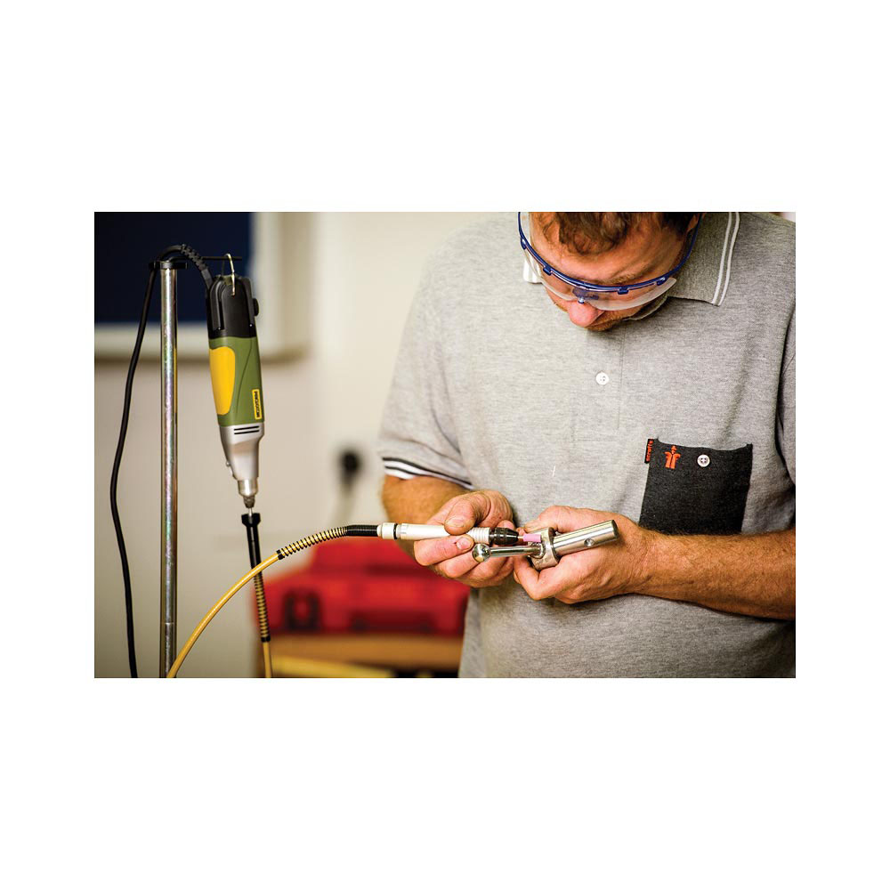 • A truly flexible shaft 1 metre long with a delicate hand piece complete with a quick action chuck 0.3mm to 3.2mm. The precision aluminium hand piece features a milled steel shaft and dual ball-bearings. The highly flexible core ensures no overheating even when working tight radii. Length 1,000mm, maximum speed 25,000rpm. The 110/BF is fitted with a quick-action chuck 0.3 to 3.2mm bringing considerable advantages especially when working with different sizes of high-speed drills, and accessories of different shank diameters.