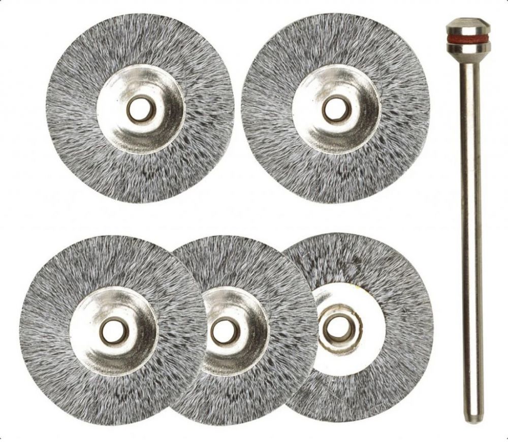 - 22mm diameter wire brushes mounted on an arbor with 2.35mm shaft diameter. Arbor plus 5 brushes