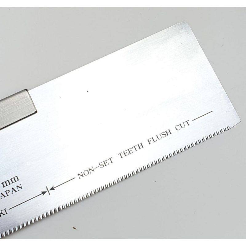 • Flush Cut Saw: The second section of the blade is used as a flush cut saw. It is not covered by the spine, so the blade is allowed to bend and flex, giving the ability to make a flush cut across a surface of timber. The teeth in this section have a ‘zero set’ (they are perfectly in line with the blade plate), so when flush cutting it will not leave a mark on the surrounding surface to the cut. The extra flexibility also give it the ability to access tight corners.