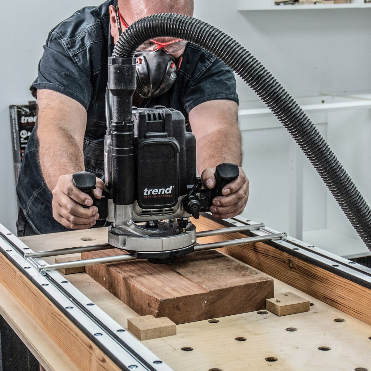 Adaptable router jig for flattening, surfacing and trenching on irregular shaped and wide material up to 400mm wide. Ideal for fine, skimming cuts and deep, levelling cuts.