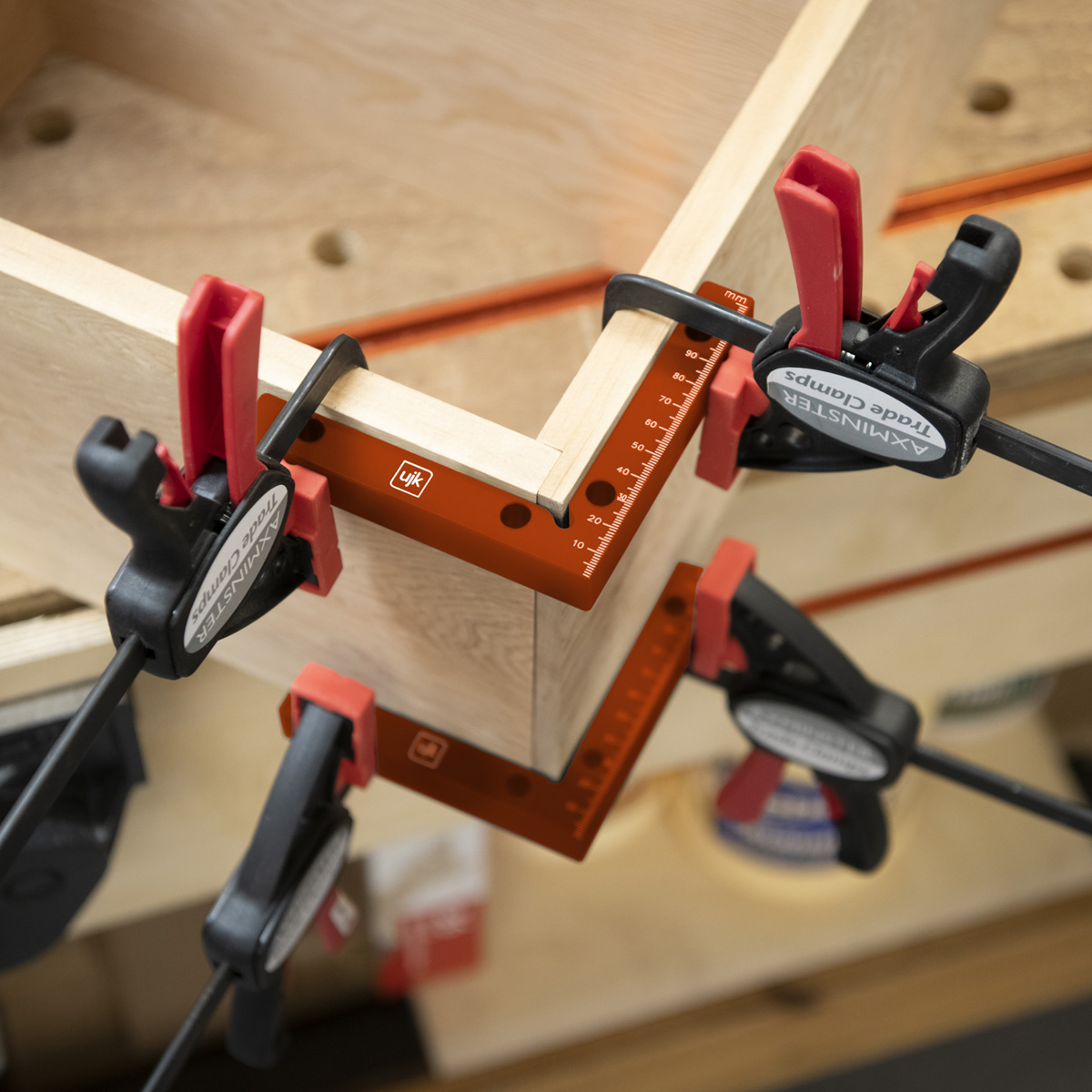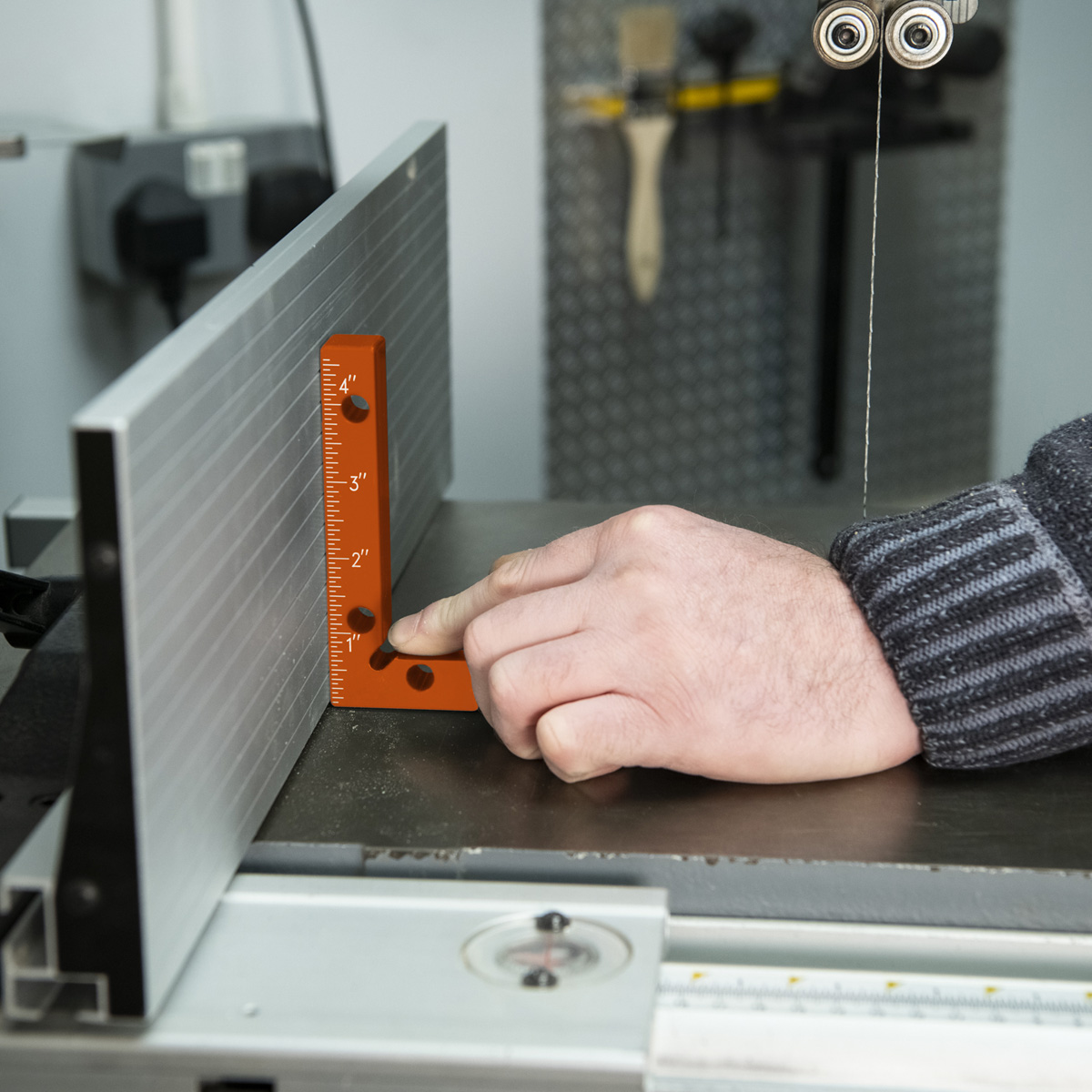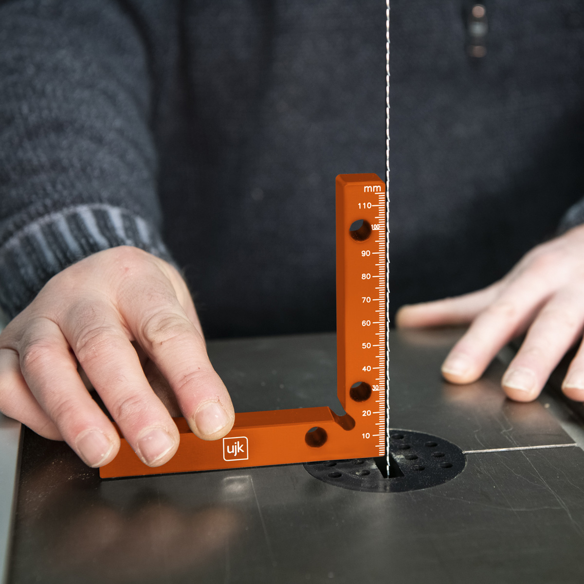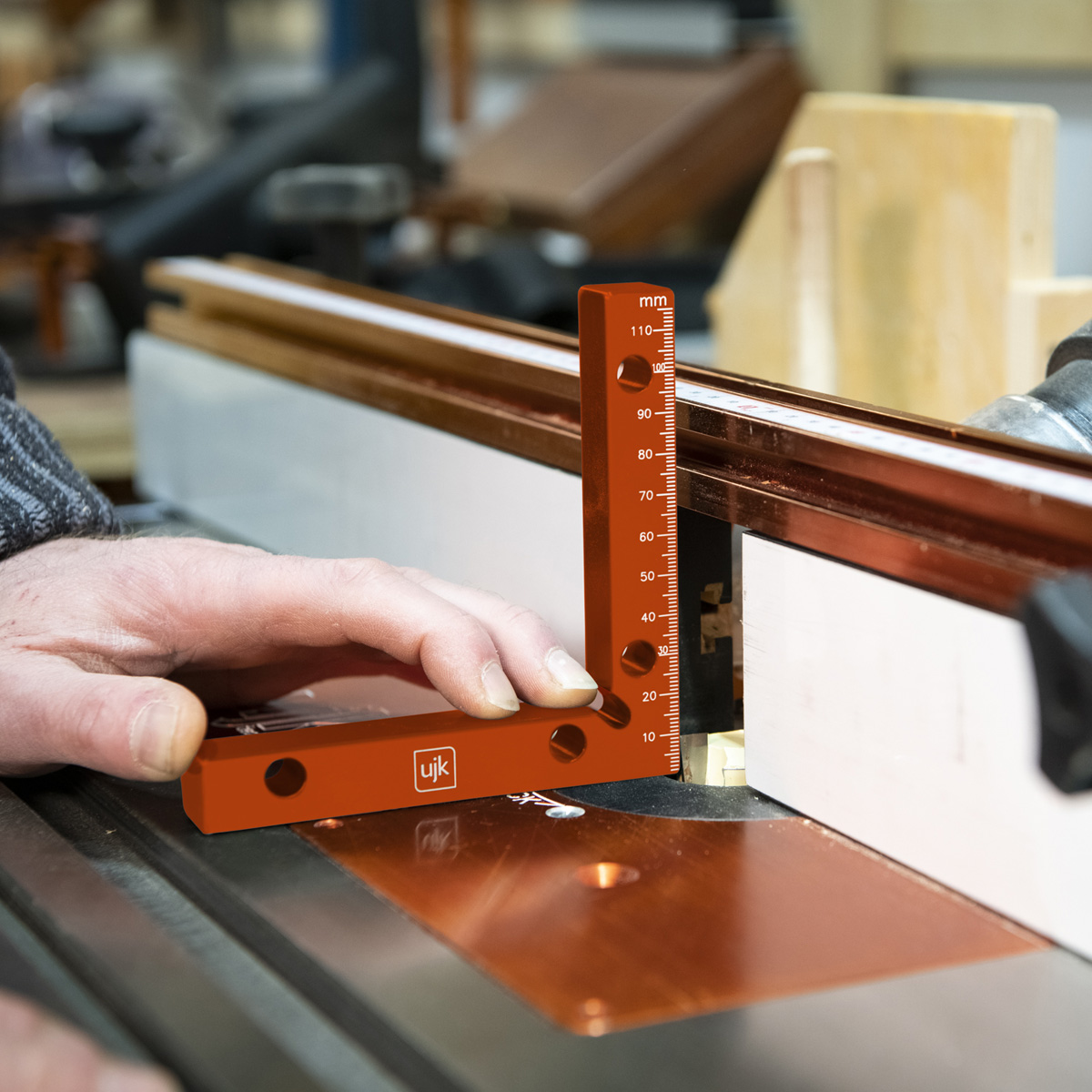 The UJK Assembly squares streamline your setup, ensuring saws, bandsaws, and fences are at precisely 90°. The graduated arm, marked in both metric and imperial, starts at the corner, doubling as a height gauge. Clamp them to secure drawer or box corners, on internal and external angles. The notched corner ensures full contact for accuracy, while the holes accommodate UJK Fence Clamps for a seamless clamping.