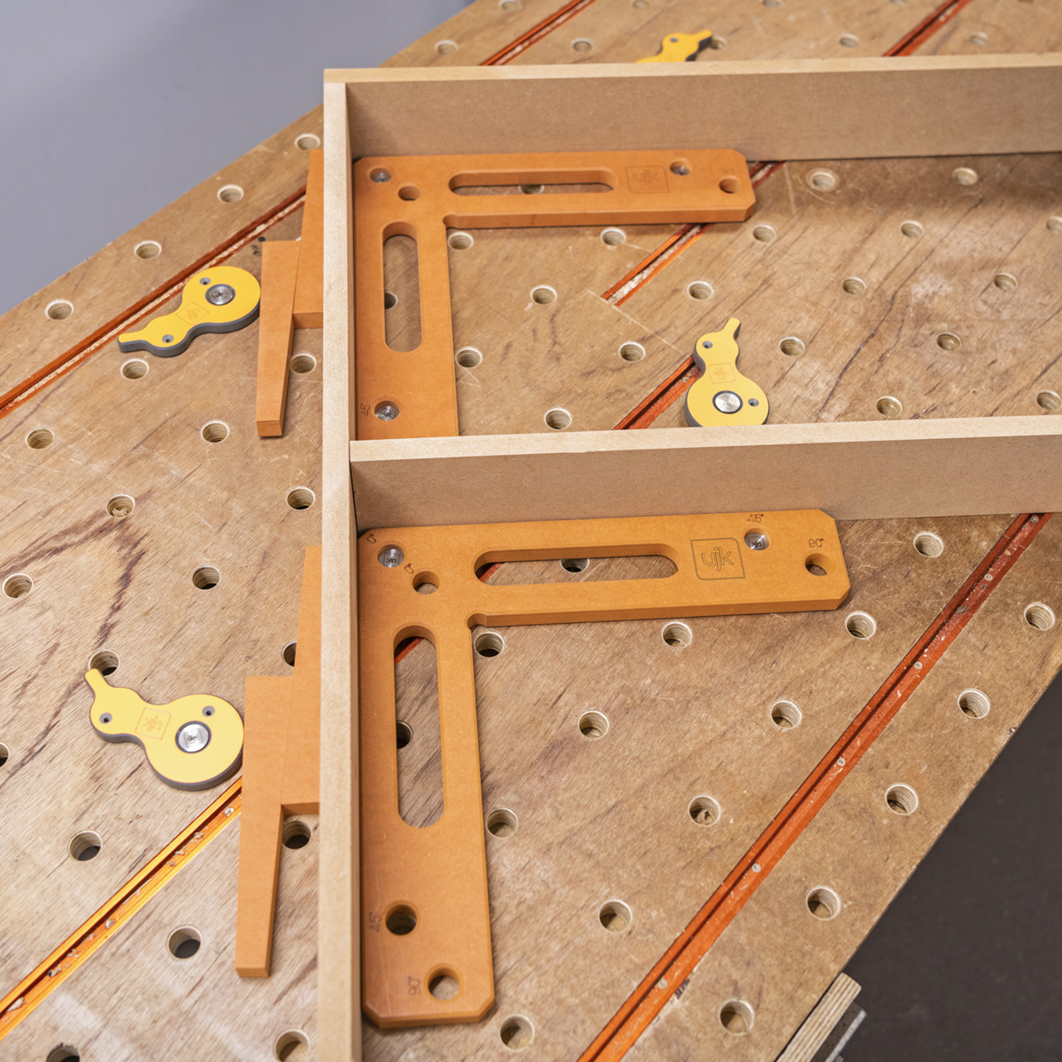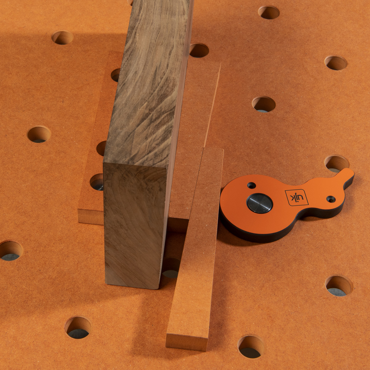 - The UJK Cam & Wedge Clamping Set has been cleverly designed to secure your workpieces on a multifunction table without any obstructions, leaving you free to route, sand, or carve with ease. The Surface Cam Clamp has an intuitive cam and wedge mechanism, allowing consistent pressure without using traditional clamps, which can be used on MFT worktops or on a plain board thanks to its screw holes. The handy backstop, has three dog holes for various positioning, whether you're working with wide or thick materials, the wedges and spacer block adapt to your project.