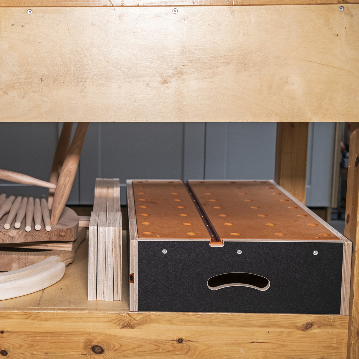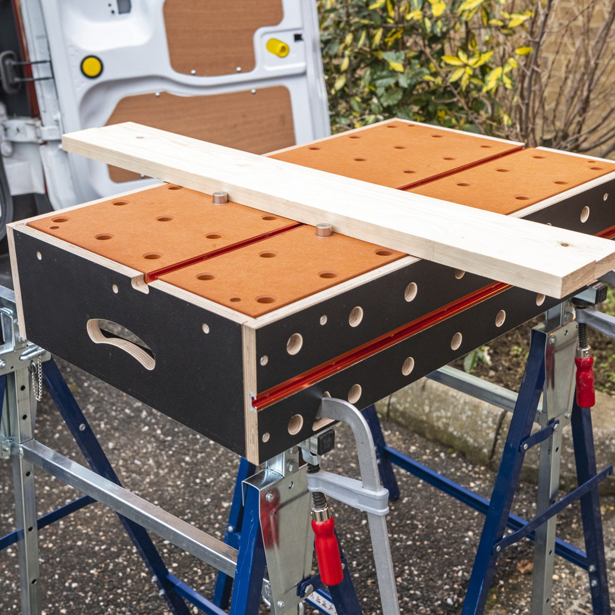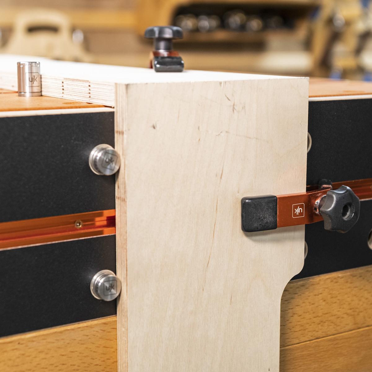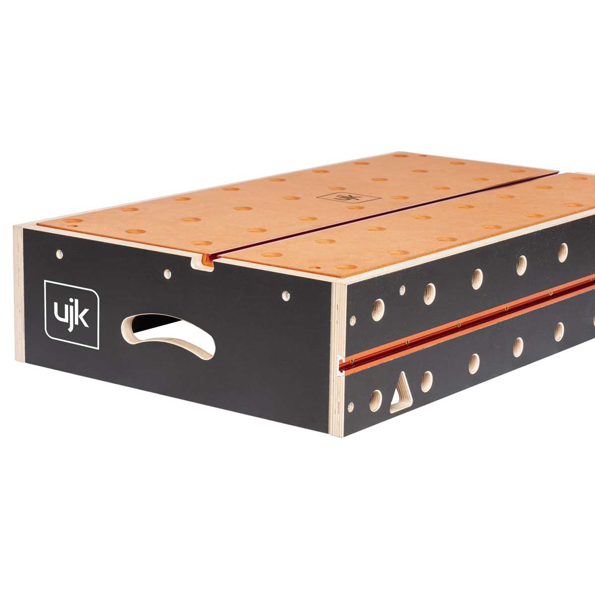 - This UJK Compact Multifunction Workbench gives you the advantages of the multifunction bench system in a compact, easily stored and transportable format. This compact version will be invaluable when working on site or in domestic situations without access to a full size bench. Use it as a mini workstation or small assembly bench. The top is 18mm thick Valchromat, the same material as used for the full size UJK Multifunction benches. It offers a generous work area of 750mm x 430mm. A grid of 20mm dog holes at 96mm centres allow you to make use of bench dogs, UJK Cam Clamps and other UJK accessories. In addition, a length of T-Track provides potential for various UJK hold downs and doubles as a 'going bar' when sawing. The outer frame is made from high quality laminated birch plywood, chosen for its strength and stability. It also features 20mm dog holes on the front face and a T-track for vertical clamping. Two clamp cut-outs allow temporary fixing to a bench top or table. The worktop is certified by the Pan European Forest Council (PEFC).