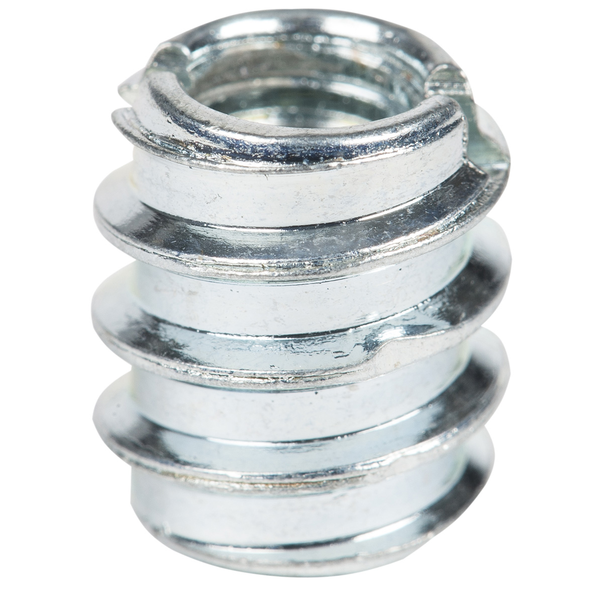 M6 threaded inserts for wood, MDF and other man-made boards. Ideal for making custom jigs and repairs. The body of the insert is 12mm long with a 10mm overall diameter. One end of the insert has a slot to accommodate a wide-bladed screwdriver. The M6 insert requires an 8.5mm or 9mm pilot hole; the optimum diameter is dependent on the hardness of the material you are using, the 9mm worked best in MDF.