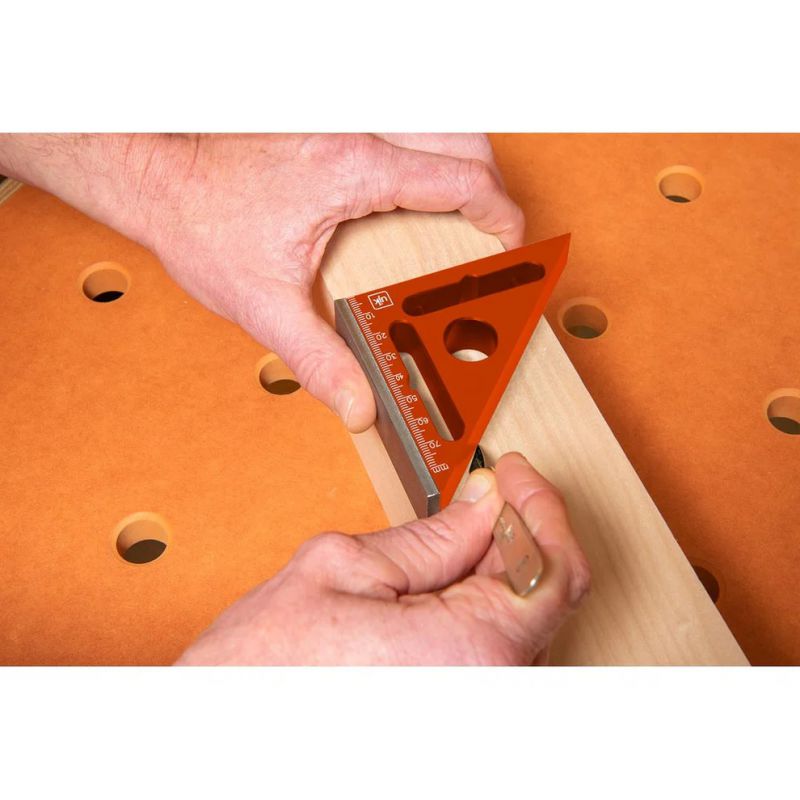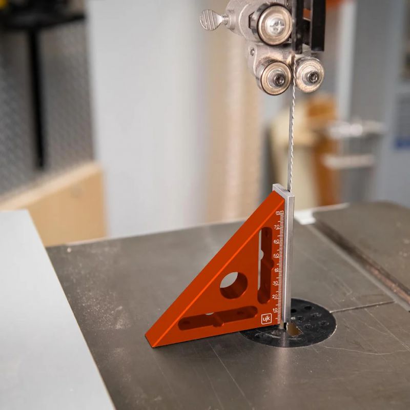 - The steel base is held in place by rare earth magnets set into the sides of the square. The magnets hold the square in place on cast-iron machine tables for setting or checking blades and fences at 90° or 45°. The scale along the edge allows you to use the square as a height gauge for saw blades and router cutters.