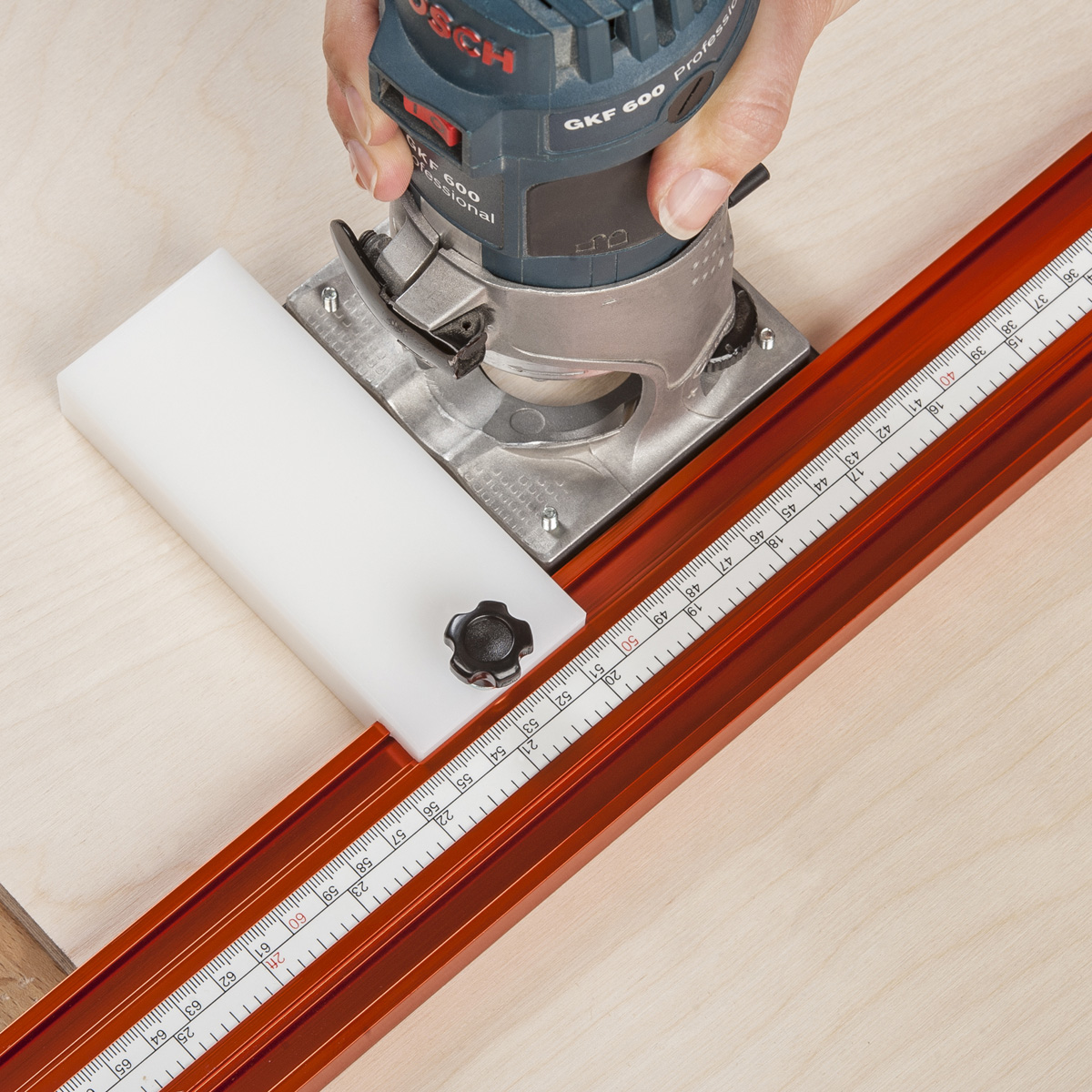 CNC machined from a solid block of engineering nylon it measures 125mm x 50mm x 20mm. The stop runs in the T-slot of your Progrip guide and locks with a simple threaded knob anywhere along the length.