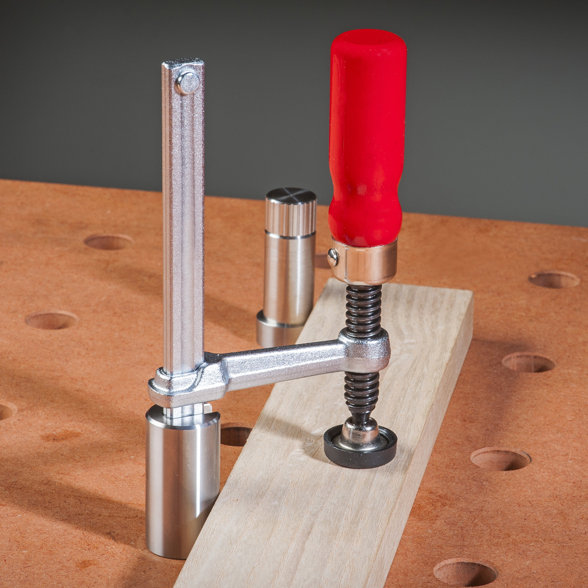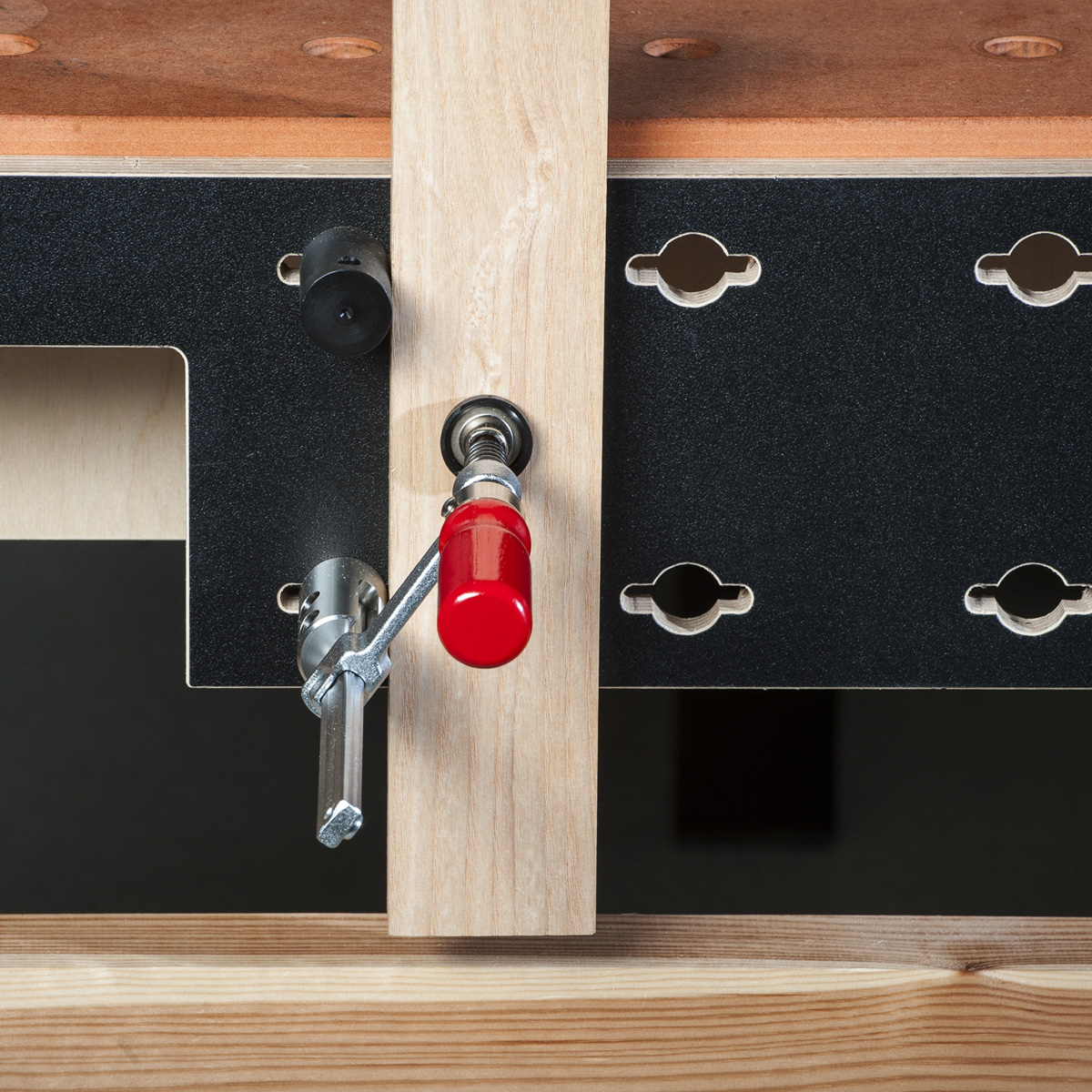 - The hold down clamp is a real bonus when you are setting up work on the vertical face of a UJK workbench. With a Twist or bench dog in one hole and the clamp directly above, you won’t need a second pair of hands.