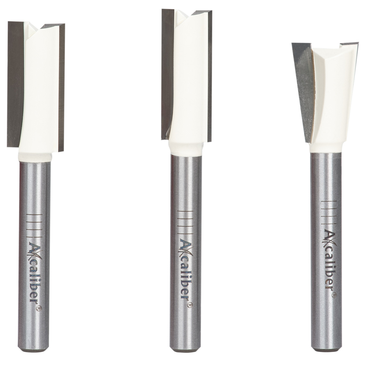 Supplied with three 1/4" shank Axcaliber precision ground TCT router cutters; A matched pair for dovetailing (7 degree dovetail and straight) and a 12.5mm straight cutter.
