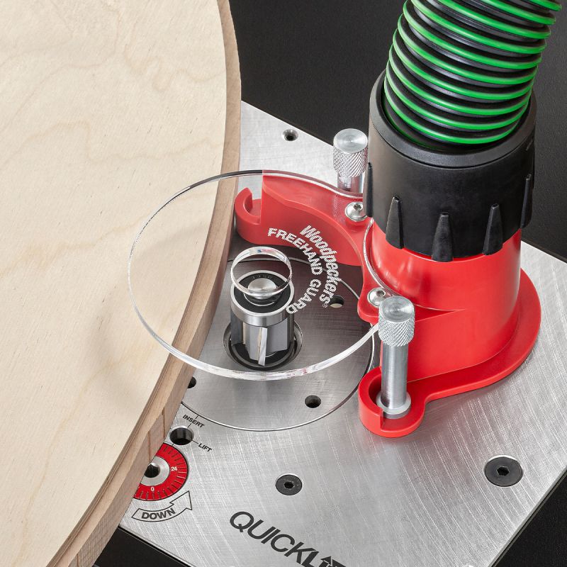 - Woodpeckers new and improved Freehand Guard covers the router bit, provides 2 starting fulcrum points and eliminates over 90% of the chips created while routing curved edges with your router table. When you're working curved shapes on your router table, the fence is just going to be in the way. Instead of working with a fully exposed bit, add the Freehand Guard to work safer and cleaner.